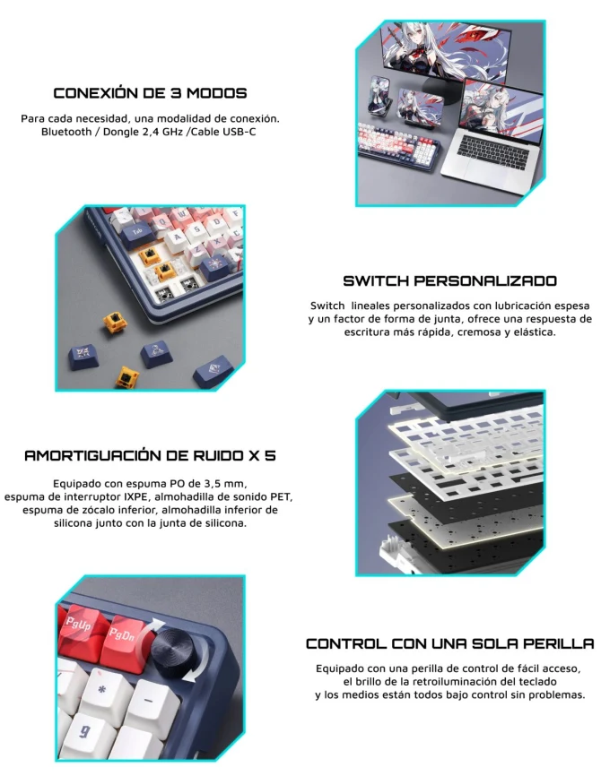Construcción: Fabricado con materiales de alta calidad como el ABS, nuestro teclado garantiza durabilidad y fiabilidad a largo plazo.